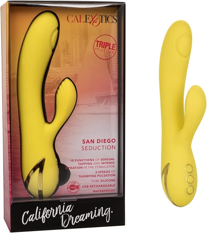 Ride the wave of indulgence with the California Dreaming™ San Diego Seduction – a premium triple-action rabbit massager made for ultimate satisfaction. Designed with 10 teasing tapping and gyration modes, 3 thumping shaft speeds, and triple motors, this vibrator delivers intense internal and external pleasure that’s anything but ordinary.